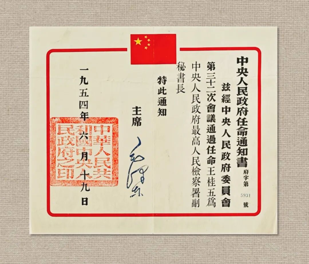 这是1954年6月19日毛泽东主席签发的王桂五为中央人民政府最高人民检察署副秘书长任命通知书,收藏于人民检察博物馆。