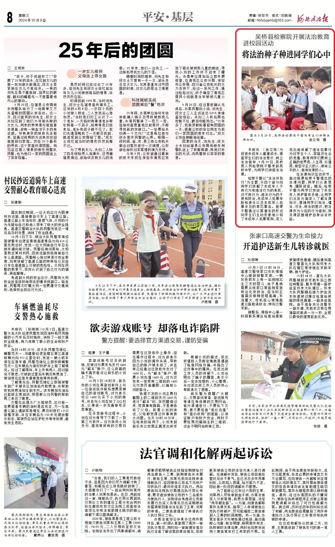 为促进未成年人健康成长,提高学生们的法治意识、树立法治信仰,9月29日,吴桥县人民检察院干警来到吴桥中学,为同学们讲授法治课。检察干警以“法治伴我行”为主题,分四个部分向同学们讲解了未成年人不良行为和违法行为的表现,对不良行为、违法行为的干预和矫治,未成年人犯罪年龄和责任以及未成年人犯罪涉及的常见罪名。授课干警通过以案普法的形式向学生们生动形象地介绍了未成年人犯罪案例,深入浅出地讲解了违法犯罪行为对学生个人、家庭及社会的危害,教育同学们要树立正确的世界观、人生观、价值观,做坚守正义的人、崇尚公平的人、信仰法律的人。在法律知识互动环节,面对授课检察干警提出的法律问题,同学们认真思考,踊跃回答。随后,检察干警为同学们发放了未成年人保护宣传手册,让同学们从各方面深入了解法律知识,增强同学们知法、懂法、守法、用法的意识,把法律作为今后的行为准则,用法律武器维护自身合法权益。