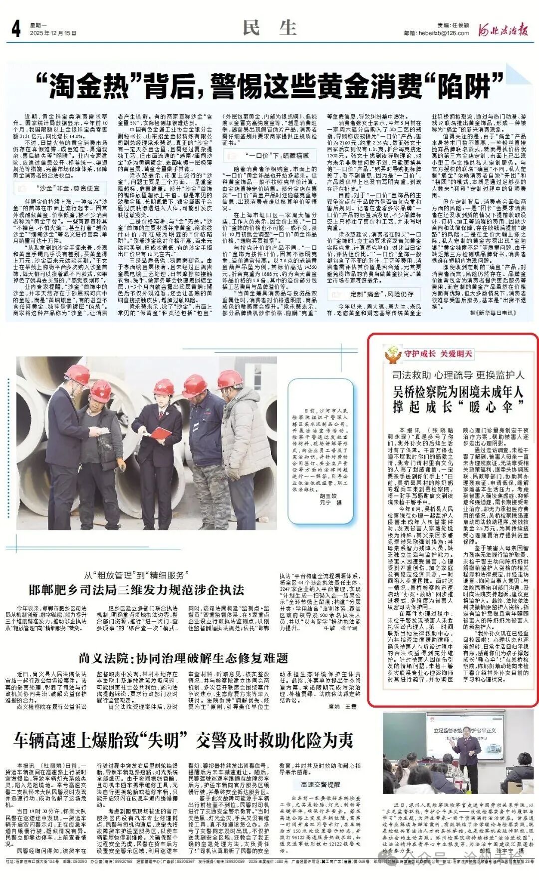 刊发原文: 本报讯 (张晓晗 郭永琛)“真是多亏了你们,我外孙女的后续生活才有了保障。千言万语也道不尽我对你们的感激之情,我专门请村里有文化的人写了封感谢信,一定要亲手送到你们手上!”日前,吴桥县某村的陈奶奶专程乘车来到县检察院,将一封手写感谢信交到该院未检干警手中。 今年8月,吴桥县人民检察院在办理一起监护人侵害未成年人权益案件时,发现被害人家庭处境极为特殊:其父亲因涉嫌犯罪被采取强制措施;其母亲系智力残障人员,缺乏独立生活与监护能力。被害人因遭受侵害,心理受到严重创伤,加之家庭没有稳定经济来源,一时间陷入多重困境。面对这一情况,吴桥检察院迅速启动“办案+救助”同步推进模式,多维度为被害人织密司法保护网。 在案件办理过程中,未检干警发现被害人未委托诉讼代理人,第一时间联系当地法律援助中心,为其指派法律援助律师,确保被害人在诉讼过程中的合法权益得到充分维护。针对被害人因创伤引发的情绪问题,未检干警多次联系专业心理咨询师对其进行疏导,并协调医院心理门诊量身制定干预治疗方案,帮助被害人逐步走出心理阴影。 通过走访调查,未检干警了解到,被害人母亲一直未办理残疾证,无法享受相关政策福利,遂牵头协调残联、民政等部门,协助其办理残疾证、申请低保,缓解家庭基本生活压力。考虑到被害人确诊焦虑症、抑郁症和强迫症,需长期接受专业治疗,却无力承担医疗费用的情况,吴桥检察院迅速启动司法救助程序,发放救助金2.5万元,为其持续接受心理康复治疗提供资金保障。 鉴于被害人母亲因智力残疾无法履行监护职责,未检干警主动向陈奶奶讲解撤销监护人资格的相关程序和法律规定,并经走访调查、询问当事人意见、与法院民事审判部门沟通,及时向法院支持起诉,建议更换监护人。最终,法院依法判决撤销原监护人资格,指定有监护意愿且常年照顾被害人的陈奶奶为被害人的新监护人。 “我外孙女现在已经重回校园啦!心理状态也逐渐好转,日常生活回归平稳有序,感谢你们为孩子撑起成长‘暖心伞’!”在吴桥检察院,陈奶奶激动地向未检干警介绍其外孙女目前的学习和心理状况。