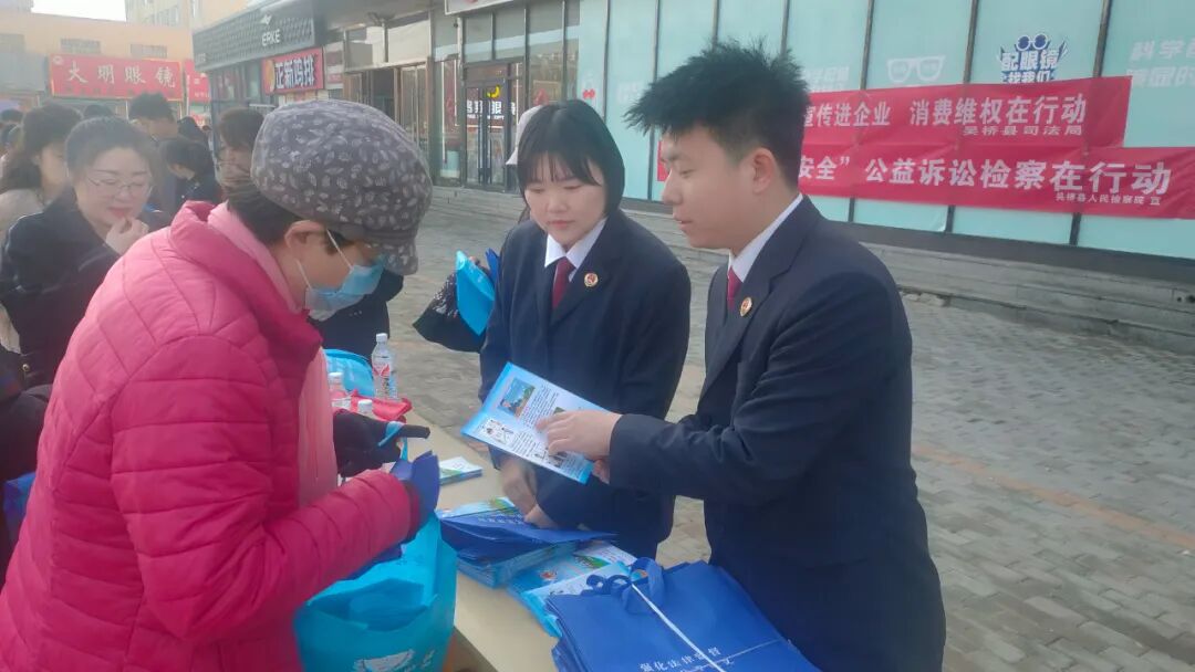 民以食为天,病以药为先,食品药品安全是民生工程、民心工程。在“3·15”消费者权益保护日来临之际,为强化消费者权益保护和优化消费环境,守护群众食品、药品安全,3月15日,吴桥县人民检察院与吴桥县市场监督管理局在信发商厦广场开展了以“提振消费信心 守护‘舌尖上的安全’”为主题的公益诉讼检察普法宣传活动。 宣传活动中,检察干警通过发放宣传册、设置法律咨询台等形式向广大群众宣讲了检察公益诉讼的相关职能,运用以案释法的方式讲解检察机关办理的涉食品、药品安全领域公益诉讼案例,让群众更加了解检察公益诉讼,积极引导群众树立科学、理性消费观念及维权意识。