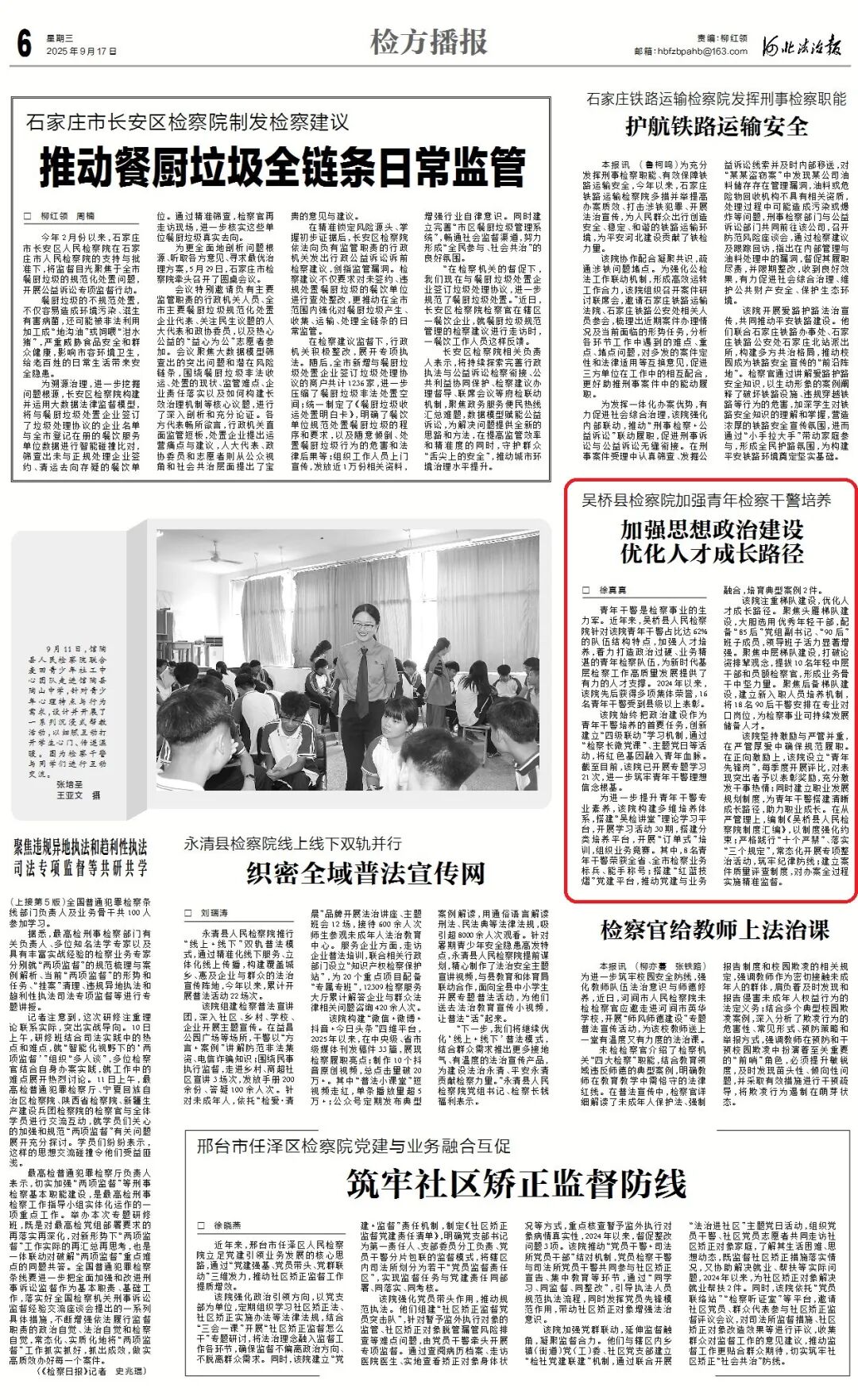 刊发原文: 青年干警是检察事业的生力军。近年来,吴桥县人民检察院针对该院青年干警占比达62%的队伍结构特点,加强人才培养,着力打造政治过硬、业务精湛的青年检察队伍,为新时代基层检察工作高质量发展提供了有力的人才支撑。2024年以来,该院先后获得多项集体荣誉,16名青年干警受到县级以上表彰。 该院始终把政治建设作为青年干警培养的首要任务,创新建立“四级联动”学习机制,通过“检察长微党课”、主题党日等活动,将红色基因融入青年血脉。截至目前,该院已开展专题学习21次,进一步筑牢青年干警理想信念根基。为进一步提升青年干警专业素养,该院构建多维培养体系,搭建“吴检讲堂”理论学习平台,开展学习活动30期,搭建分类培养平台,开展“订单式”培训,组织业务竞赛。其中,8名青年干警荣获全省、全市检察业务标兵、能手称号;搭建“红蓝技熠”党建平台,推动党建与业务融合,培育典型案例2件。该院注重梯队建设,优化人才成长路径。聚焦头雁梯队建设,大胆选用优秀年轻干部,配备“85后”党组副书记、“90后”班子成员,领导班子活力显著增强。聚焦中层梯队建设,打破论资排辈观念,提拔10名年轻中层干部和员额检察官,形成业务骨干中坚力量。聚焦后备梯队建设,建立新入职人员培养机制,将18名90后干警安排在专业对口岗位,为检察事业可持续发展储备人才。该院坚持激励与严管并重,在严管厚爱中确保规范履职。在正向激励上,该院设立“青年先锋岗”,每季度开展评比,对表现突出者予以表彰奖励,充分激发干事热情;同时建立职业发展规划制度,为青年干警搭建清晰成长路径,助力职业成长。在从严管理上,编制《吴桥县人民检察院制度汇编》,以制度强化约束;严格践行“十个严禁”、落实“三个规定”,常态化开展专项整治活动,筑牢纪律防线;建立案件质量评查制度,对办案全过程实施精准监督。(徐真真)
